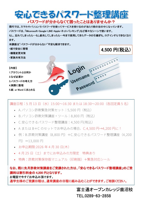 しっかり学びたい方向け(90分) ・緊急ボタン設置(当校独自のアプリ)PC及びスマホに ・簡易マニュアル(1枚) ・詐欺講座・実際の詐欺デモ画面を見て ・画面を見ながら使い方説明等 ・操作練習 現代では、スマホやパソコンでパスワードを使ってサービスを受けるのが当たり前の世の中になっています。 パスワードは、「Micorosoft・Google・LINE・Apple・ネットバンキング」など様々なシーンで使います。 もし、忘れてしまったら・・もし紛失してしまったら・・今まで使用してきたデータの引継ぎも、ログインすらできなくなります。 本講座は"パスワードが分からない"不安も解消できます。 ・紙で安全に管理・機種変更対策 ・家族共有方法 【内容】 1.アカウントとは何か 2.なぜ必要か 3.パスワードの考え方 4.実際に整理 5.紙 or Wordにまとめる 【日程】 講座日程:5月13日(水)15:00~16:30または18:30~20:00 ※他日程も検討中です。お気軽にご相談ください。