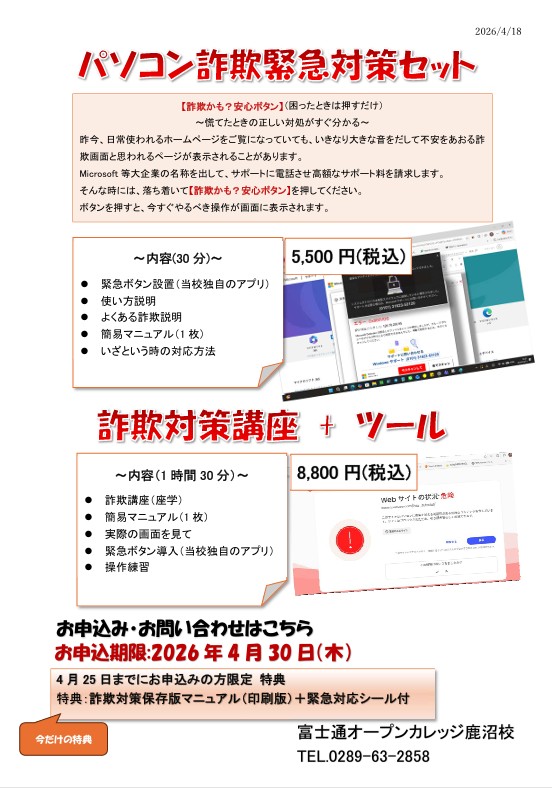 詐欺対策・パスワード整理講座のご案内お悩み事を解決します! 講座(1) パソコン詐欺対策講座 日程:随時ご予約 ・実際の画面で解説 ・対処方法 ・安心ボタン設置